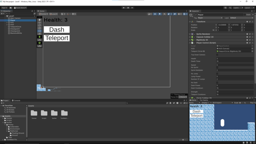 Bellow is all the code that I made in this small test project in Unity. It includes: camera follow (2 types), player movement (walking, sprinting, jump, dash and teleport), player health, damage, checkpoints and projectiles.