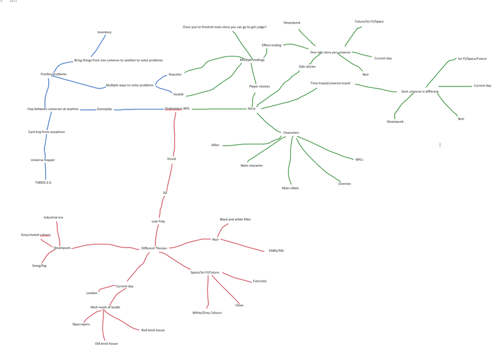Mind mapping allowed me to get the ideas that I had unformatted in a list into something that made more sense and was clearer to anyone else. It allowed me to show the connections between ideas that I could see within my list but other might not. It also allowed me to expand on my initial thoughts and ideas by looking at would connect well with what I had already put down. Though mind maps are good at showing and expanding on your ideas about story and gameplay it’s not very good at visual ideas as you don’t have images. Images are a lot better at representing and expanding upon visual ideas then words are. So mind maps are good for formatting your initial ideas about gameplay and story but I would create a mood board for visual ideas.