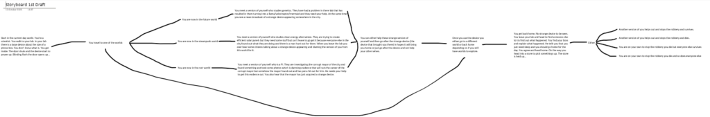 The storyboard was helpful to get an understanding of what I wanted to do with the story in my game and also develop it. I need to spend more time refining the story so I will make more storyboards to help develop it. I did find though that a storyboard isn’t great with non-linear stories so I found it difficult to convey how the story flowed and changed depending on the players choices. I will also create storyboards for each side story line I will have for each world. Even though those stories will effect the main story I will probably have to put them on separate storyboards as a storyboard is only able to support one story.