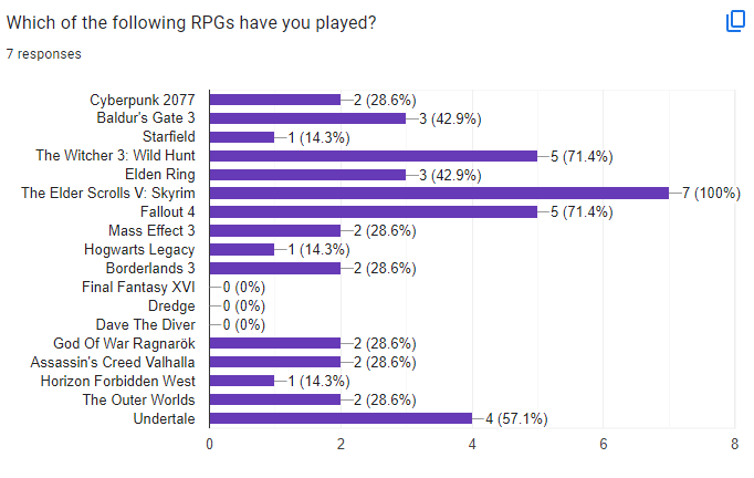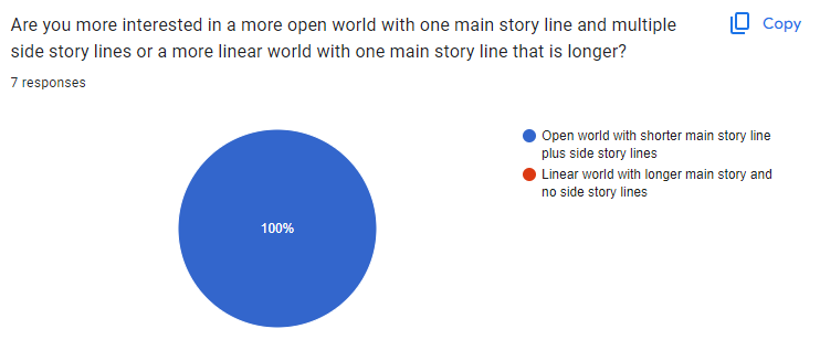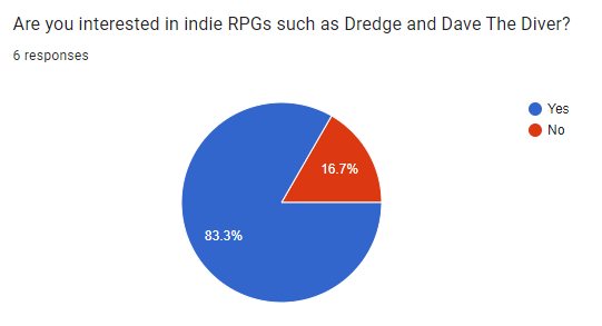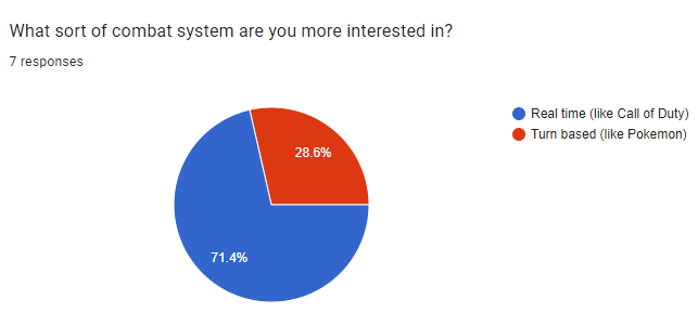 A questionnaire is a very good way of getting a vague idea of what your audience wants. It gives you a lot of quantitative data that you can work with but it also allows you to get some qualitative data as well. It helps inform you of what direction you should be going with your game and can also help you develop your ideas. But it doesn’t allow you to have a full discussion with people so there can be misunderstandings but also if someone gives a interesting answer to a qualitative question you can’t further explore their idea with them as you don’t have direct contact with them. The questionnaire for me helped me develop my story and world for my game as I got an idea of what people wanted. It also helped me figure out what sort of combat system I wanted.