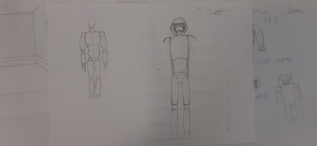 We then used the traced version to copy the outline onto paper. We then added colour and developed the character further.
