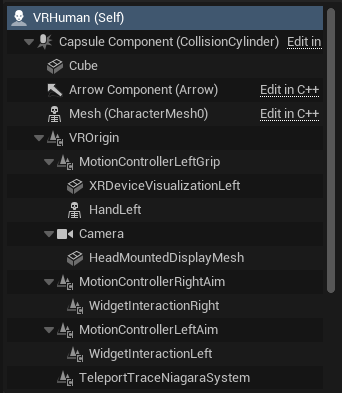 2) Method two was to create a character pawn which comes with the character movement component which does have gravity. The problem here is that when I copied everything over from the base pawn into this new one everything becomes a child of the collision capsule which messes up the set tracking origin function as location is now based around the capsule and not the world. This results in the player being very tall. If I set location for the VR origin to be related to the world then the player doesn’t move as the movement effects the capsule.