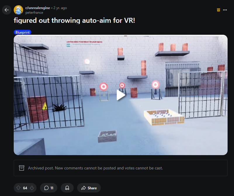 peterfrance (2021). Reddit – The heart of the internet. [online] Reddit.com. Available at: https://www.reddit.com/r/unrealengine/comments/12kienb/figured_out_throwing_autoaim_for_vr/ [Accessed 27 Apr. 2025].