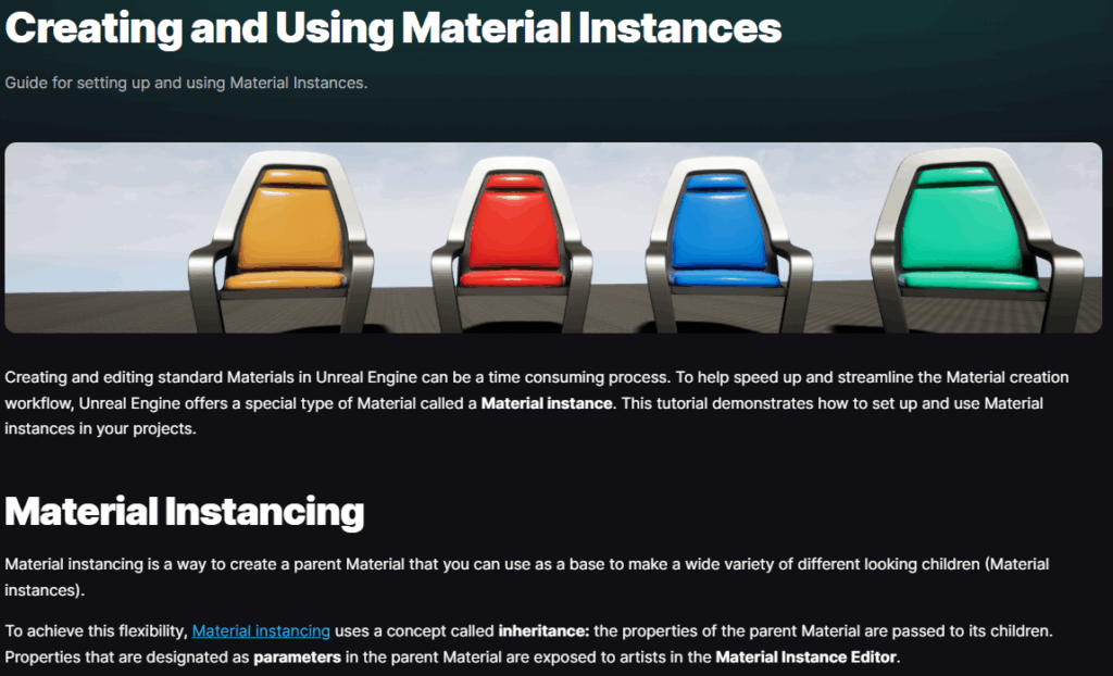 This is Unreal Engine documentation about how material instances work. This was really helpful as it explained exactly what I needed and I got material instances working in my project very quickly with the help of the documentation. This was exactly what I needed. The only problem I have is I wish all UE documentation was like this. A lot of UE documentation is very lacking and not helpful which means you have to find other sources to understand how features work in UE.